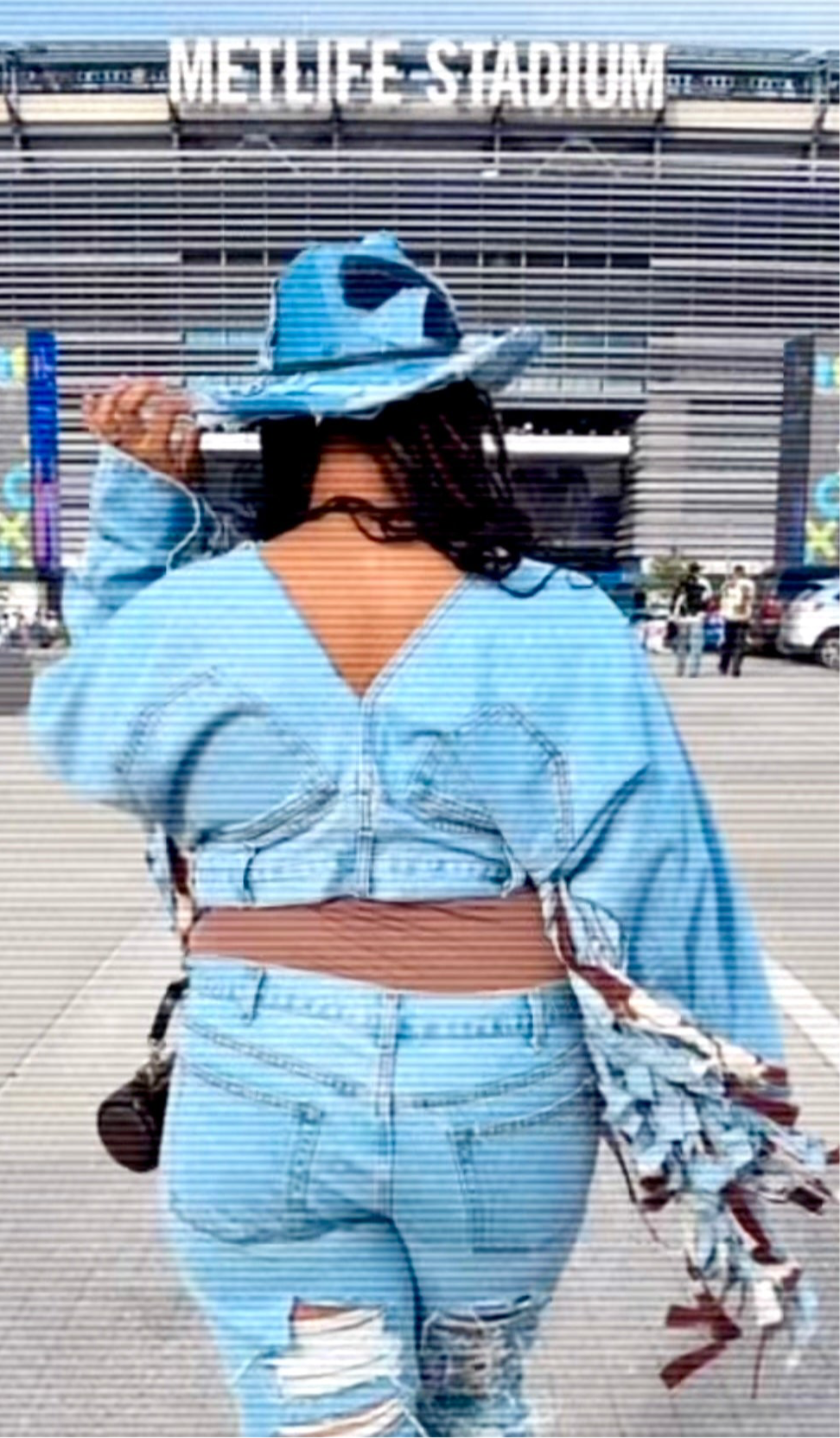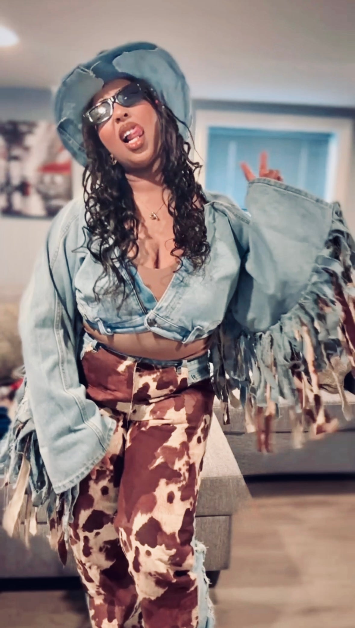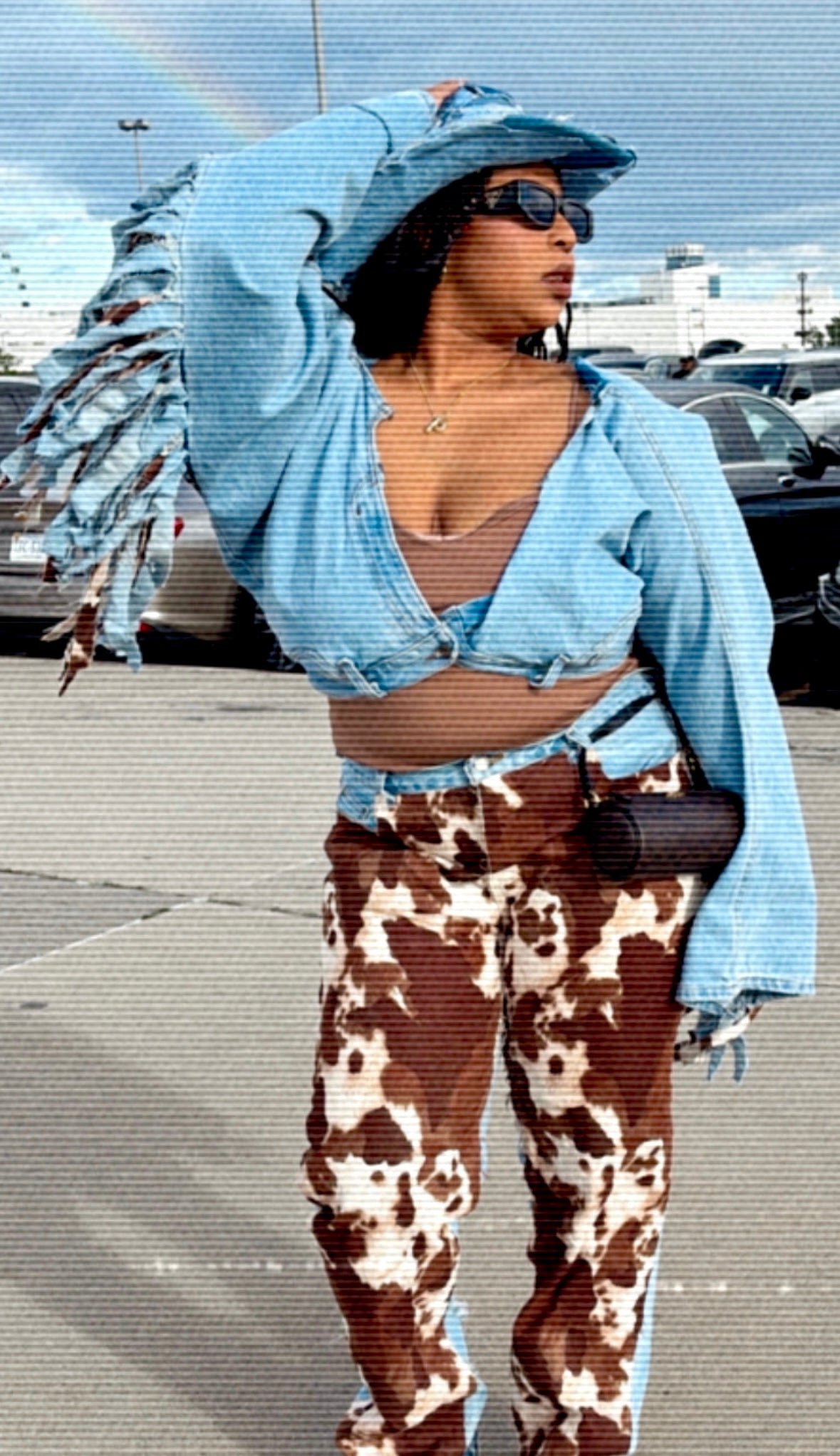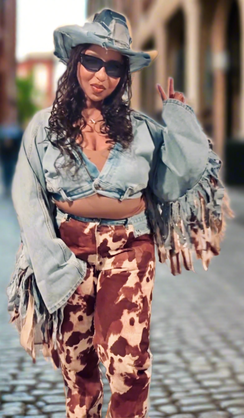 The fringe denim and cow print leg sleeves add a touch of playful quirkiness. Stand out from the crowd with this statement piece. Ready for any rodeo.