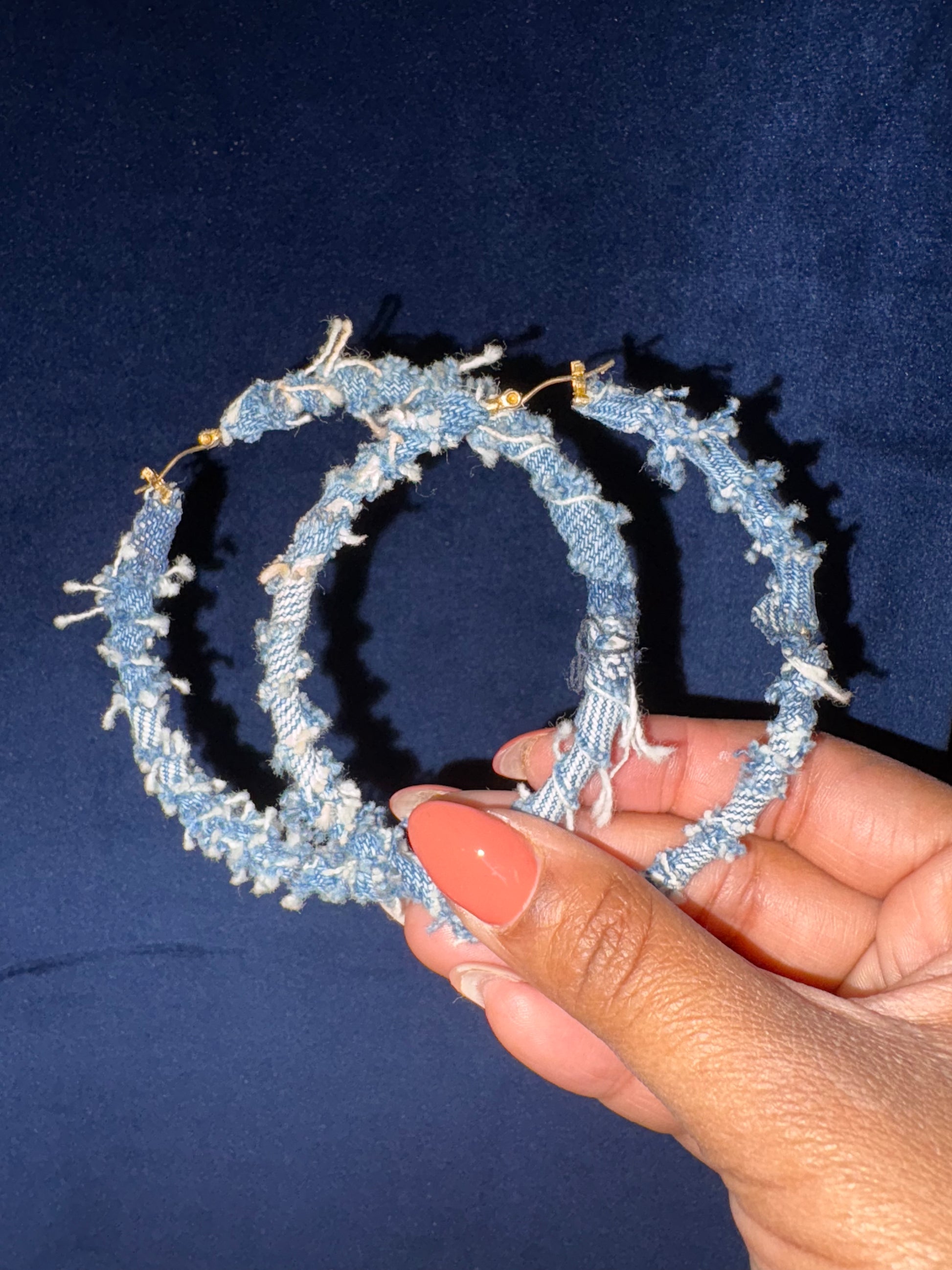 Indulge in the timeless elegance of our Denim Hoops. These handcrafted hoops are a statement of sophistication, crafted with the finest denim for a touch of luxury. Elevate your style with these exclusive hoops, perfect for completing any outfit.