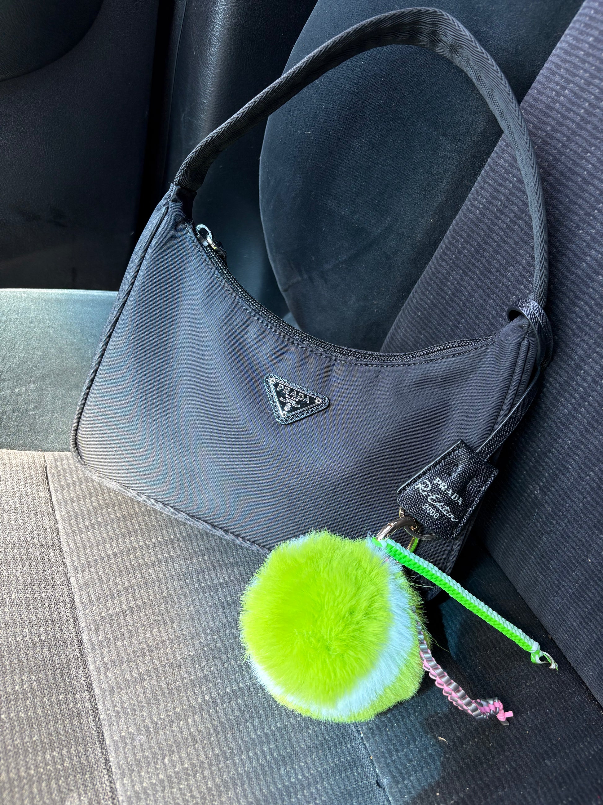 Featuring a playful tennis ball shape with a stylish box and butterfly pattern gimp string, this charm will surely catch everyone's attention. A fun and unique accessory for any bag.