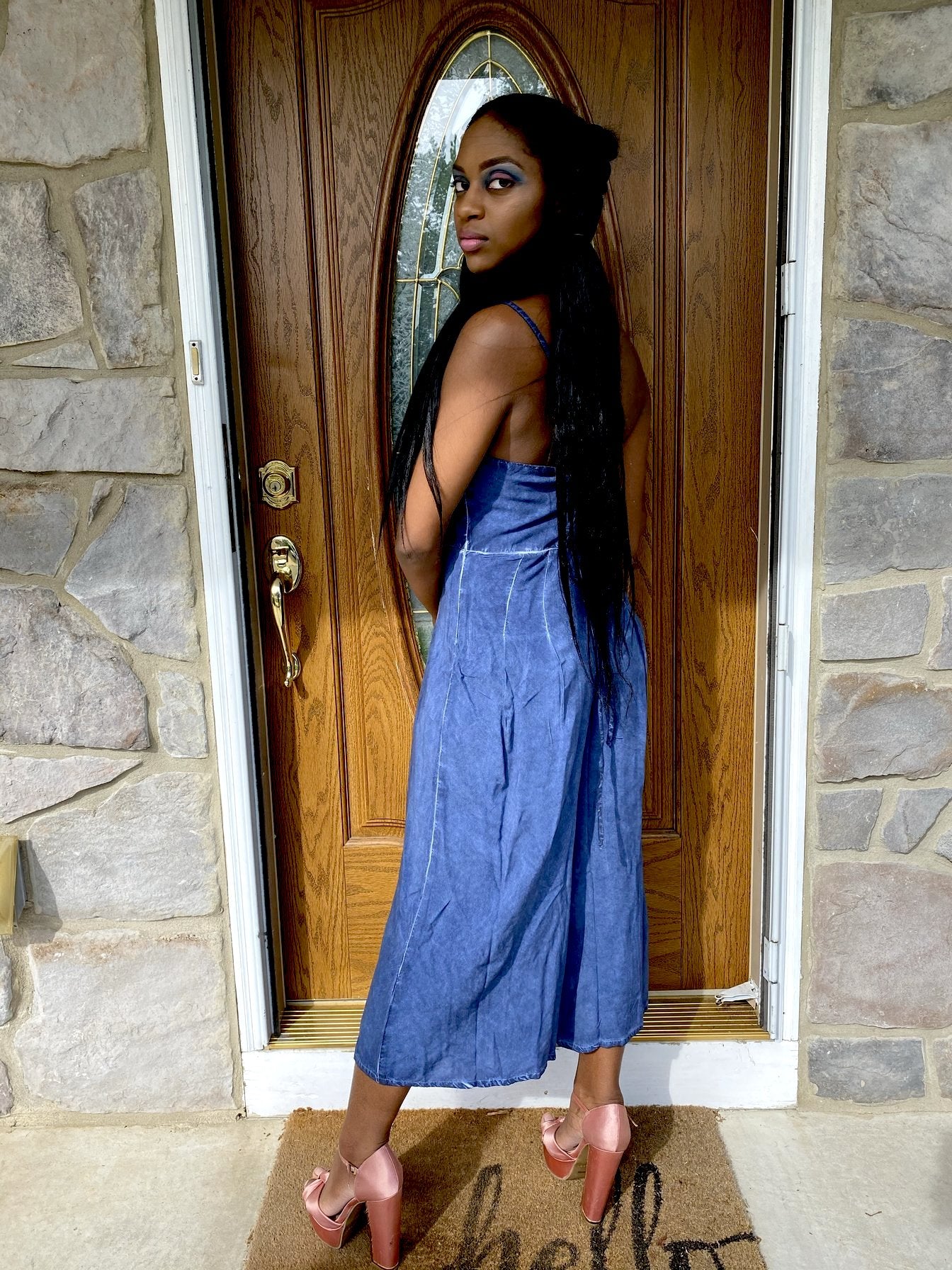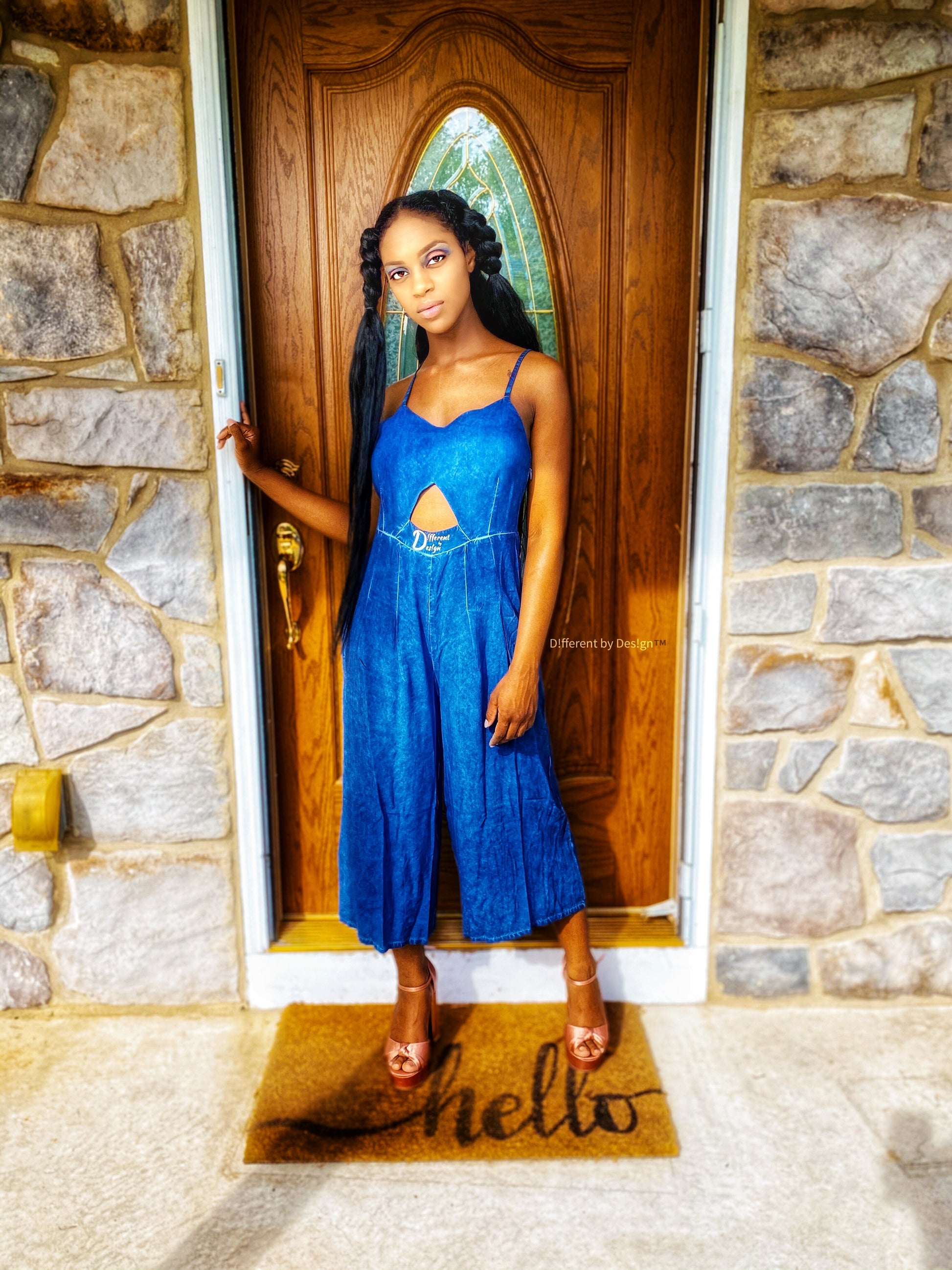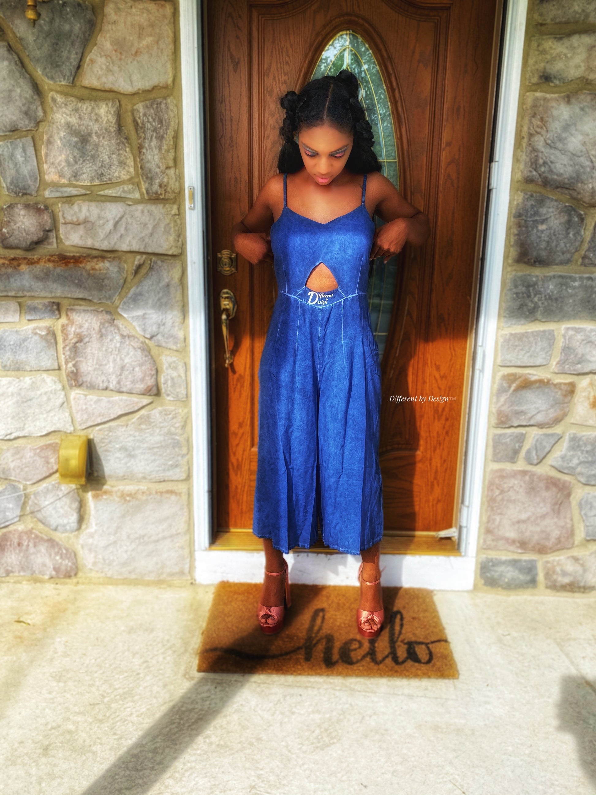 Thin spaghetti strap denim culotte one piece with full logo, front cut out and tie back.