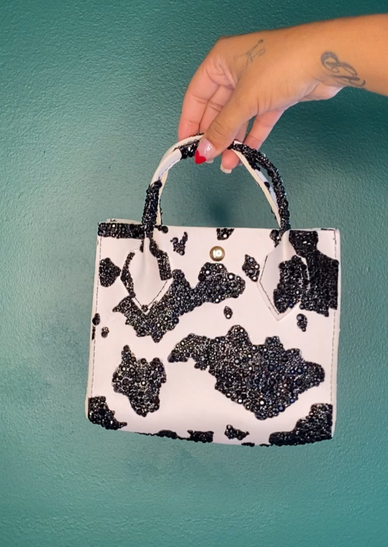 "Get ready to turn heads with our Moooo 2.0 bag - it's our Moo bag on steroids! This vegan leather handbag features a playful cow print design that's hand jeweled with black crystals. A unique and quirky addition to your wardrobe!"