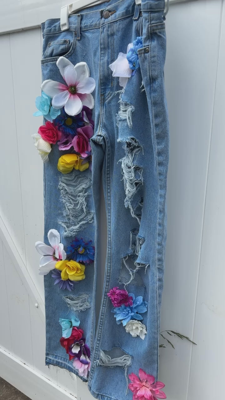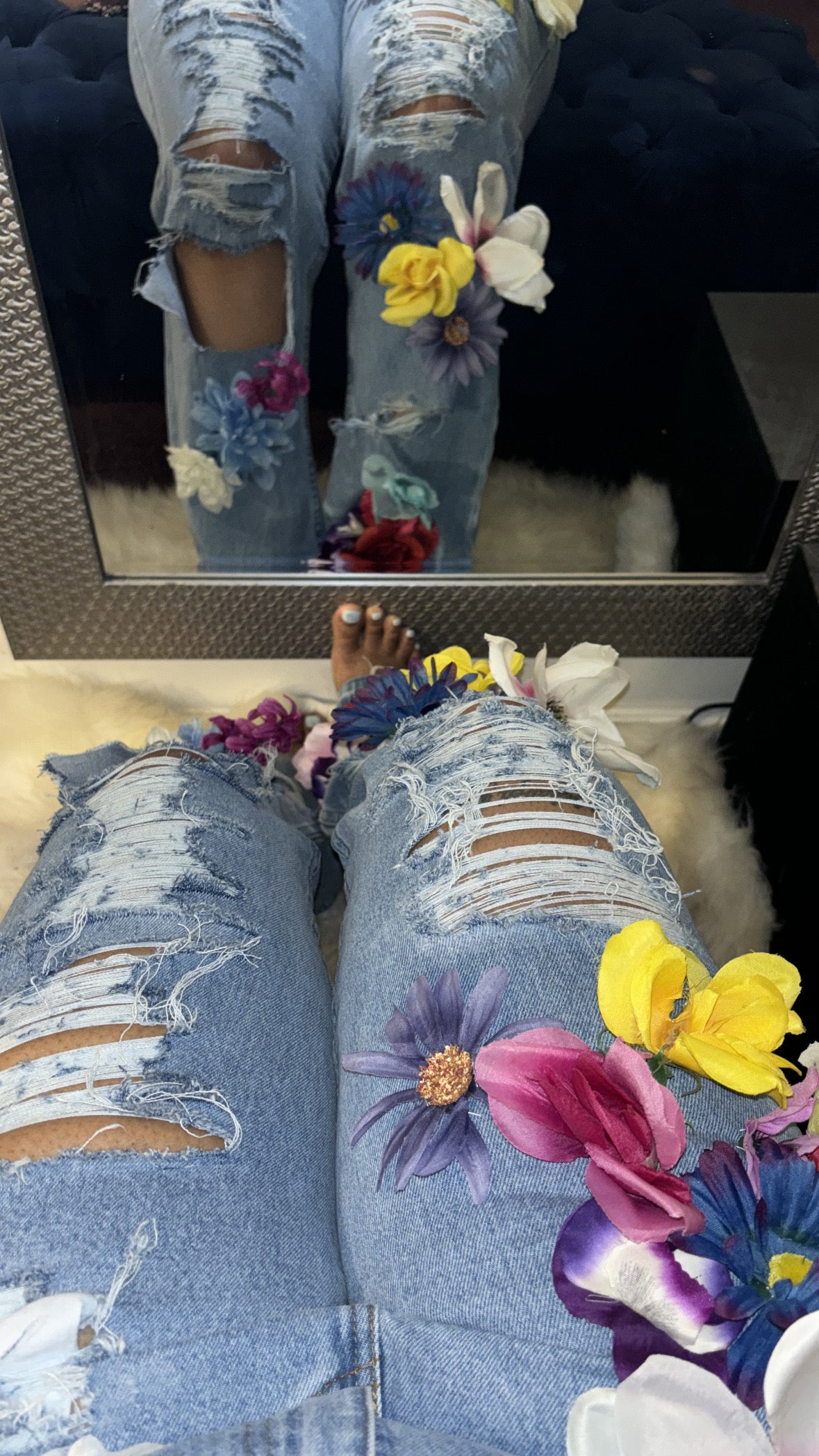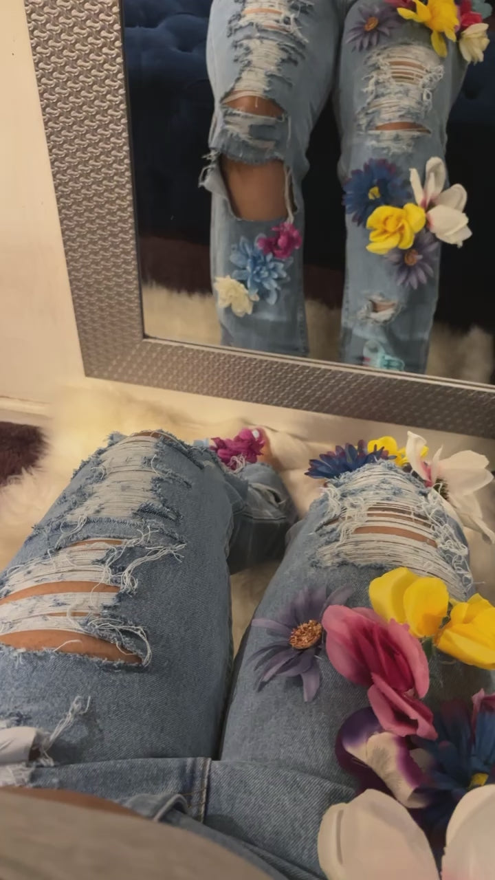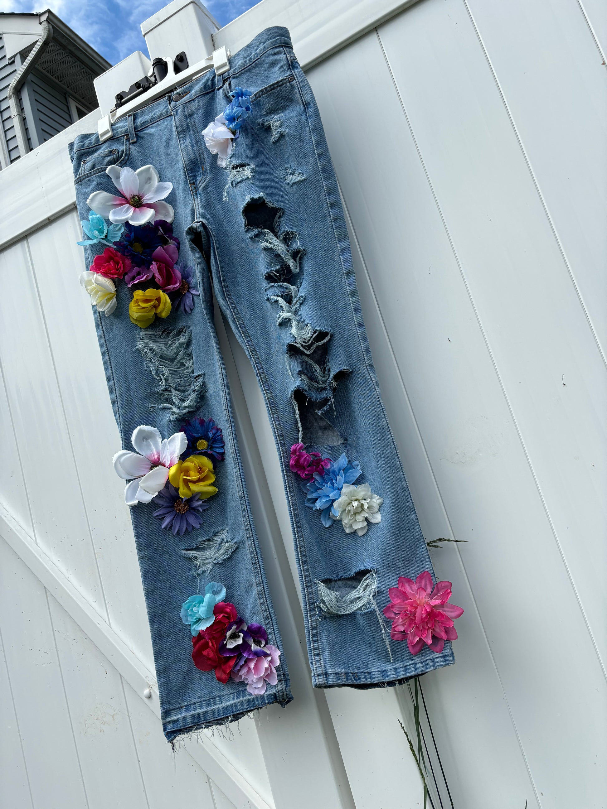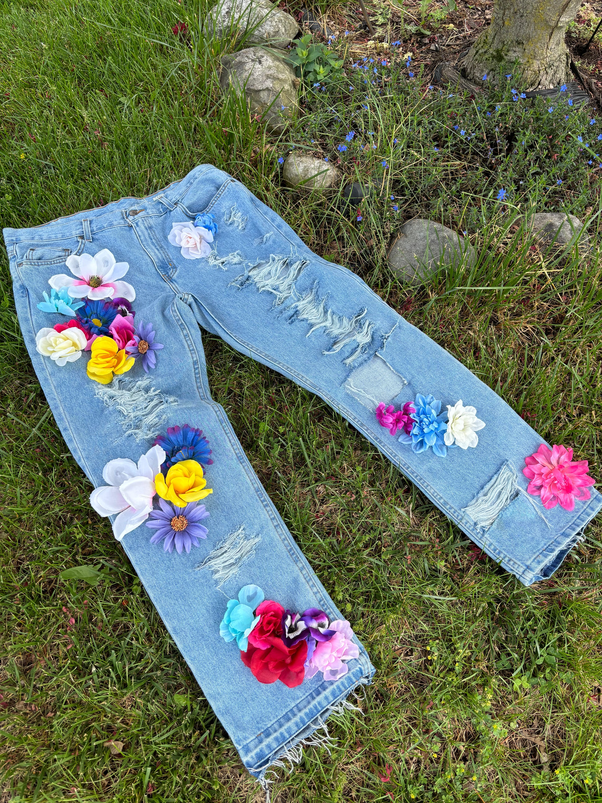 Get ready to bloom with The Flower Shop! These hand distressed jeans are adorned with hand sewn artificial flowers, adding a playful and unique touch to your outfit. Perfect for anyone looking to add a touch of whimsy to their wardrobe.