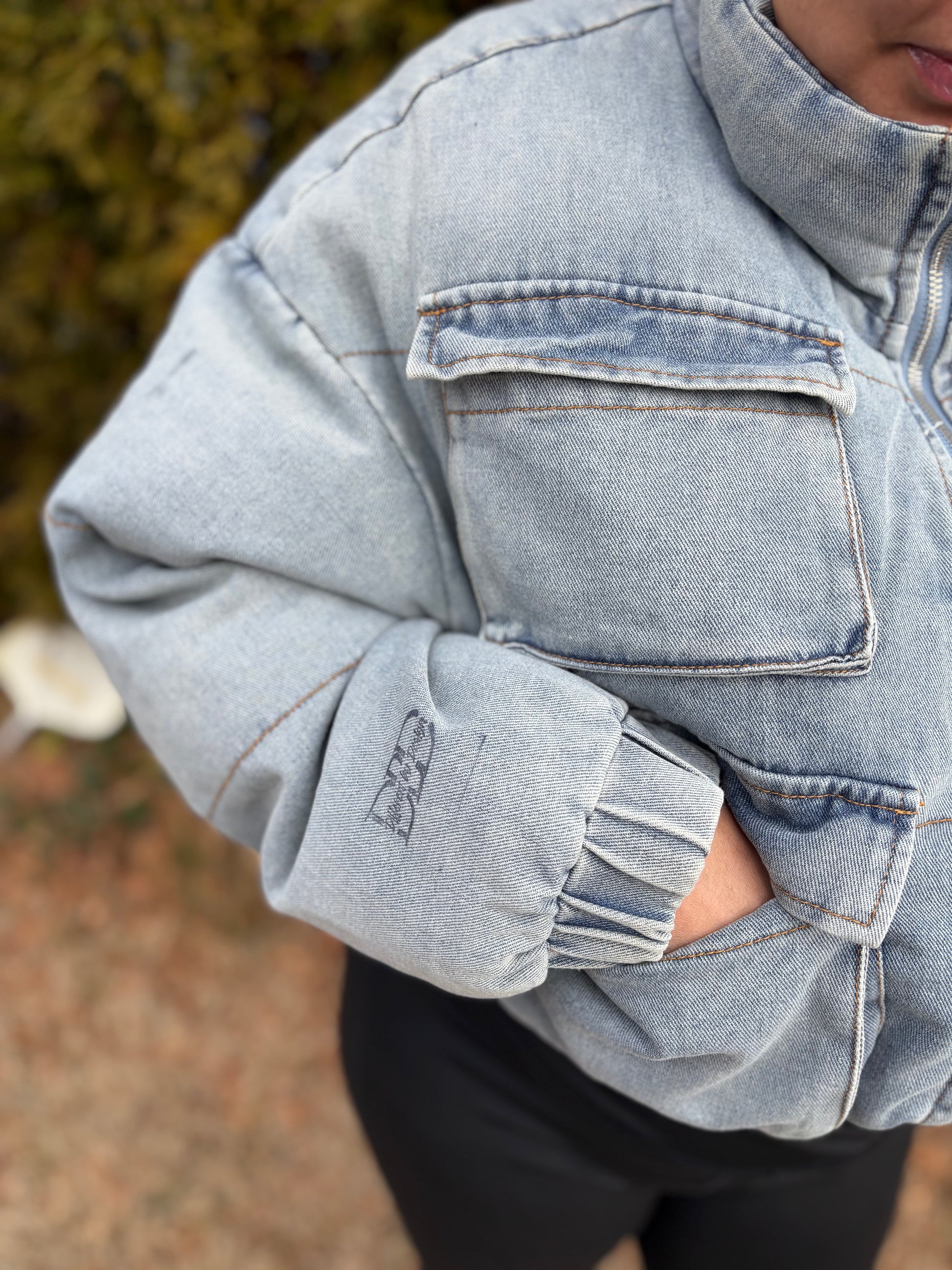 Introducing the Den!m™️ Puffer - the perfect combination of cool and cozy. Made with high-quality denim, this puffer coat will keep you warm and stylish all winter long. Say goodbye to boring winter wear and hello to a unique and playful look.