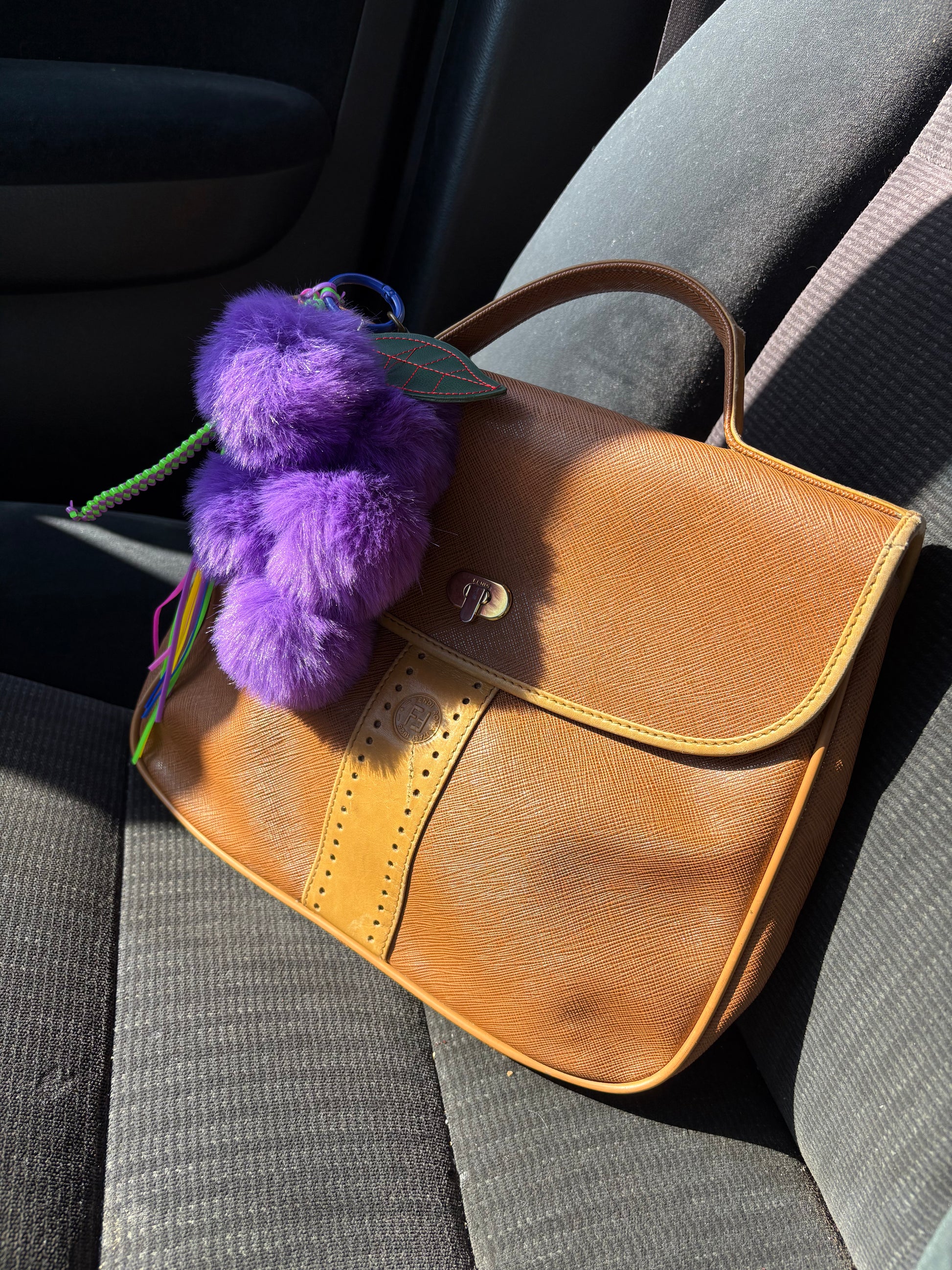 This fuzzy grape shaped charm features a unique butterfly gimp design and playful gimp tassel. Never lose your bag again in a sea of boring accessories.
